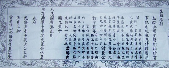 乾隆五十年(1785),四海承平,天下富足。适逢清朝庆典,乾隆帝为表示其皇恩浩荡,在乾清宫举行了千叟宴。宴会场面之大,实为空前。被邀请的老人约有三千名,这些人中有皇亲国戚,有前朝老臣,也有的是从民间奉诏进京的老人。在座老人中有不少是饱学鸿儒,当众吟诗联句,即席用柏梁体选百联句被史官记录入史。乾隆皇帝还亲自为90岁以上的寿星一一斟酒。当时推为上座的是一位最长寿的老人,据说已有141岁。当时乾隆和纪晓岚还为这位老人做了一个对子,“花甲重开,外加三七岁月;古稀双庆,内多一个春秋。”根据上联的意思,两个甲子年120岁再加三七二十一,正好141岁。下联是古稀双庆,两个七十,再加一,正好141岁。堪称绝对。